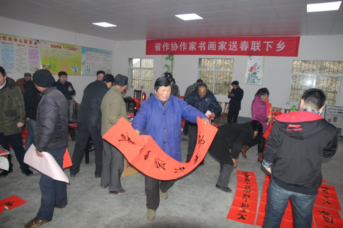 活动中,省作协领导带领驻村工作队员走访慰问了部分生活困难家庭,并给他们送去慰问金。1月18日朱训集、梁必文一行在龚店村村民活动中心内现场为村民书写春联、送祝福,共创作春联600余幅,为即将到来的鸡年春节增添了喜庆祥和的气氛。