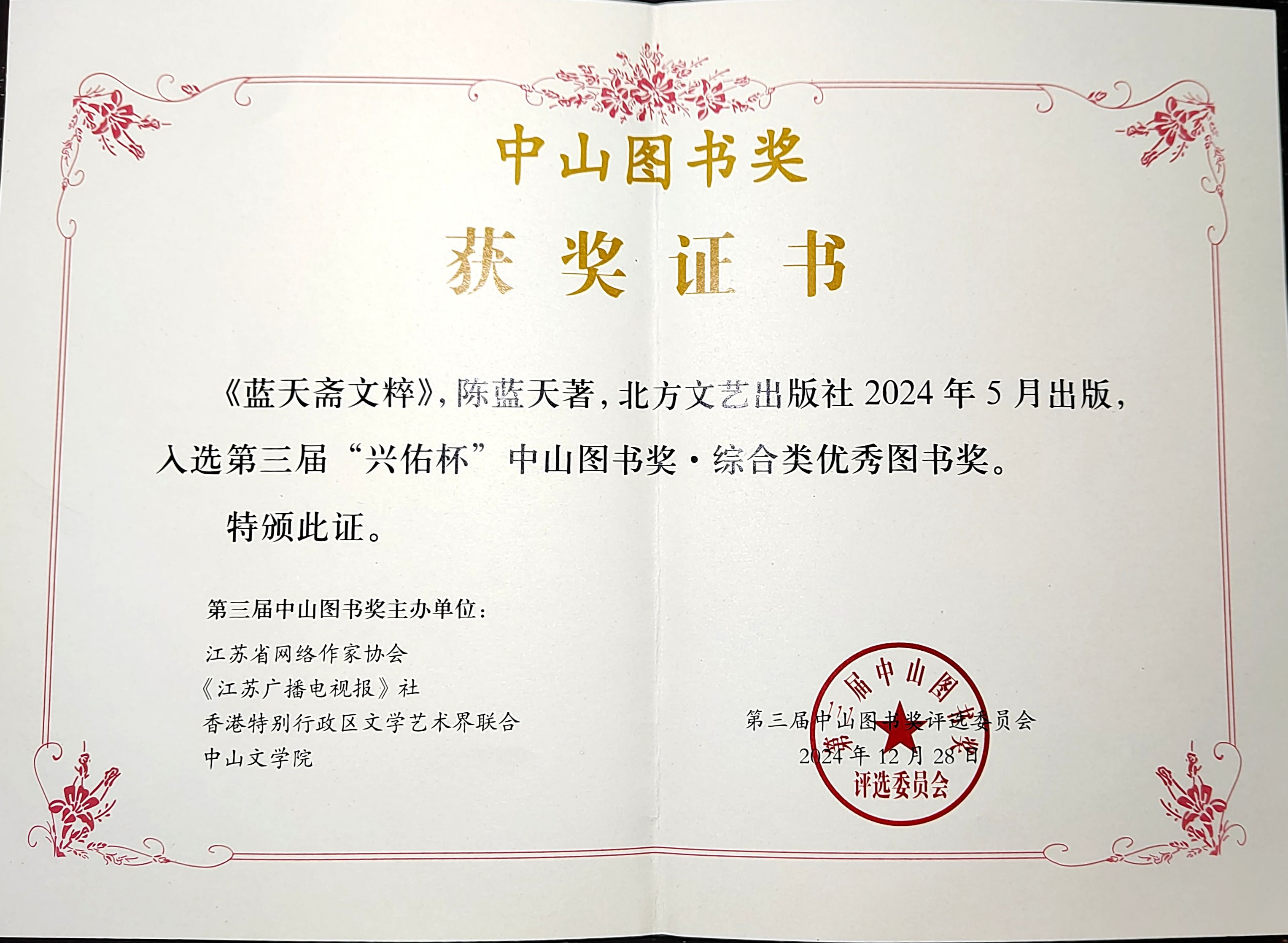 近日,湖北省作协会员陈蓝天所著文集《蓝天斋文粹》入选第三届“兴佑杯”中山图书奖·综合类优秀图书奖。此次图书奖由江苏省网络作家协会、江苏广播电视报社、香港特别行政区文学艺术界联合会、中山文学院等四单位联合举办。目前,该文集已被国家图书馆、中国现代文学馆、中国当代作家签名版图书珍藏馆和全国31所省市图书馆,以及清华、北京、复旦等全国30所985大学,共64所图书馆已收藏。