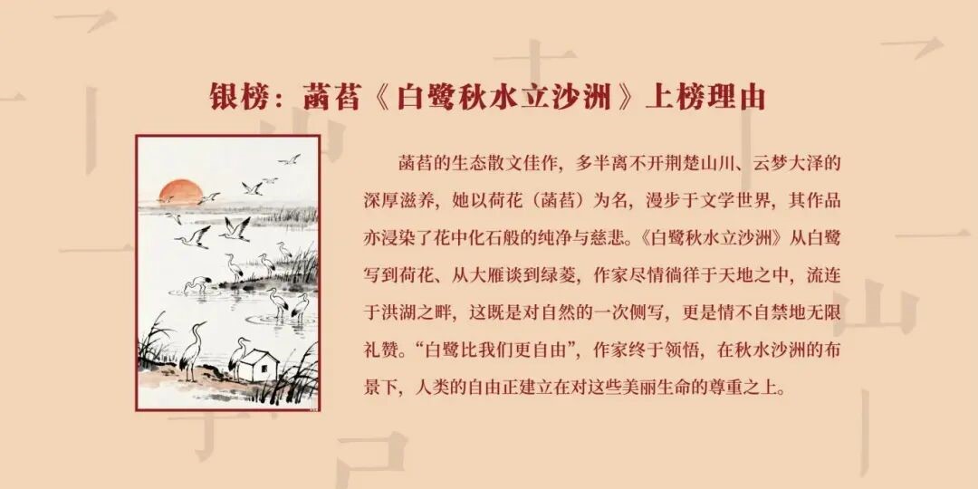 9月28日,丰子恺原创散文双年榜发布暨2025丰子恺艺术周启动仪式在浙江省嘉兴市举行,中国作协党组成员、副主席、书记处书记吴义勤讲话,中国作协副主席徐贵祥出席,市委书记陈伟致辞。双年榜上榜作者及评委代表、丰子恺家属、嘉兴市文学爱好者等百余人参加了本次活动。湖北作家朱朝敏凭借《江豚》入选“金榜”,菡萏以《白鹭秋水立沙洲》入选“银榜”。