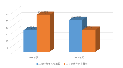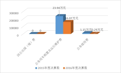 分析:2016年度无因公出国(境)费用,公务用车运行维护费用16.07较2015年度23.94万元减少7.87万元,主要是2015年8月施行省直机关公车改革后,运行费用减少,同时2016年严格控制公务用车运行经费;2016年公务接待费0.29万元较2015年度1.15减少0.86万元。 “三公”经费在严格管理和监控下,比以前年度大大降低。