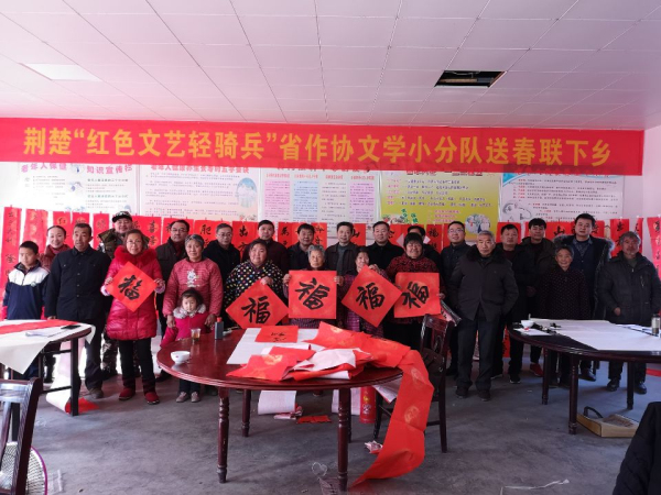 2019年1月22日-23日,省作协党组成员、副主席江清和率领荆楚“红色文艺轻骑兵”省作协文学小分队一行赴随州市曾都区洛阳镇龚店村开展送春联下乡活动。新到任的省作协党组书记文坤斗一行在龚店村慰问贫困户的同时,专程来到活动现场看望送春联下乡的作家书法家和村民们并与他们交谈、观摩,氛围热烈。