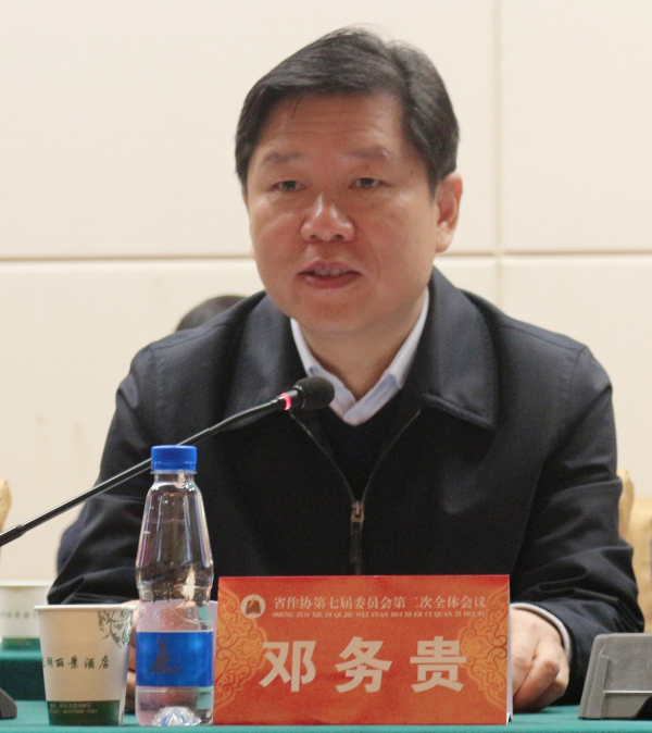 邓务贵在讲话中充分肯定了一年来省作协工作取得的成绩。从深入学习贯彻习近平总书记重要讲话、担当新时代历史使命、把握以人民为中心的创作导向、崇德尚艺、深化作协改革四个方面,对全省文学工作提出具体要求。他强调省作协要努力把习近平总书记重要讲话精神,贯穿到文学创作和作协工作的各领域、全过程。要聚力推动湖北文学精品创作生产,教育引导文学工作者夯实以人民为中心的思想根基,坚持用明德引领风尚。要充分发挥政策的导向和激励作用,聚焦时代主题,突出荆楚特色,打造“长江文化”品牌。省作协要切实加强党的领导,全面深化改革,进一步转变工作职能,统筹抓好文学队伍建设。守正创新、奋发进取,努力开创新时代湖北文艺事业繁荣发展的新局面。