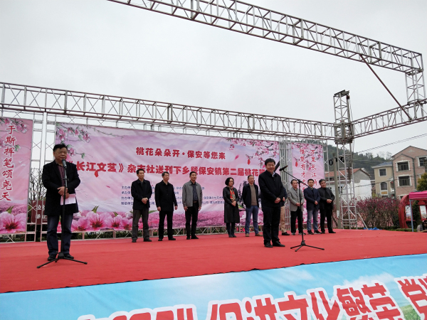 文坤斗书记在致辞中回顾了自己在方志办工作时与保安镇结下的不解之缘,盛赞保安美景,赞美保安文化和旅游相结合促进乡村旅游、乡村振兴所取得的成绩。他说,文艺最能代表一个时代的风貌,最能引领一个时代的风气。在两会刚刚闭幕之际,湖北省作家协会、《长江文艺》杂志社和大冶市委宣传部开展送刊下乡活动,是贯彻落实习总书记重要讲话精神,是让文化走进基层、走进生活、走进群众的惠民之举。在这桃花灿烂时节,名镇保安第二届桃花笔会将是一次激情与灵感大碰撞的盛会,是一次才情与财富大演绎的盛会!宣布了《长江文艺》送刊下乡暨保安镇第二届桃花诗会开幕。