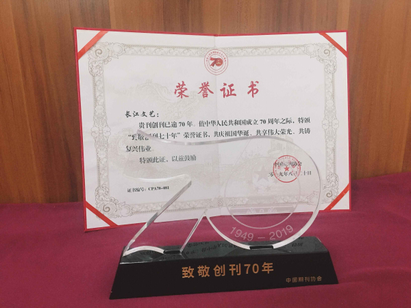 2019年8月20日,在中国期刊协会于北京举办的迎接新中国成立70周年期刊出版座谈会上,《长江文艺》杂志获得“致敬创刊70年”荣誉称号。此次评选共有102家期刊获得“致敬创刊70年”荣誉称号,其中多数为学术期刊,仅有三家文学期刊获此殊荣,另外两家是《人民文学》和《鸭绿江》。