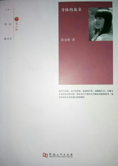散文集《身体的花朵》收录了徐金秋近年来创作发表的散文诗百余首,分“乡村辞”、“浮世换”、“时光谣”、“红颜慢”、“他山吟”第五辑,书中作者是以普通人的视角和散文家的笔法,淋漓尽致地表达了对家乡、对亲人、对朋友、对生命的拳拳深情和感悟追求,既有对当下现实生活抱有怀疑和思考,也有对美好未来充满幻想和期待。
