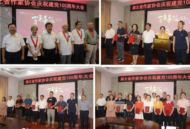 会议在奏(唱)《国歌》声中开始。面向鲜红的党旗,文坤斗带领新老党员重温入党誓词。党组领导向老党员代表曲虹、刘富道、谢克强、周增木颁发“光荣在党50年”纪念章,向获得省委直属机关工委表彰的优秀党务工作者王桐贵和先进基层党组织、“红旗党支部”长江文艺杂志社党支部,以及受省作协党组表彰的12名优秀党员、3名优秀党务工作者和2个先进党组织颁发荣誉证书和奖牌。