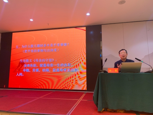 任蒙以“散文的格局与情怀”为题,与文学爱好者们作了专题讲座。他指出目前海量散文的某些通病:游记散文“有闻必录”、情感散文“家长里短”、怀旧散文“往事流水帐”。他从为什么要写散文、为什么散文必须坚持写真实、为什么散文写作似易实难、为什么说发散性思维不可缺少、为什么散文题材多半是平常事物、为什么说格局决定散文的高度、散文语言有哪些特点等方面,解答了散文写作中的各种疑难困惑。他通过引用名刊文章、名家名言,古今结合、理论联系实际等方式,用自己的亲身经历与经验,让文学爱好者们进一步掌握了散文写作的突破口。讲座结束后,两位作家回答文学爱好者们提问,开展互动交流,现场气氛热烈,大家均表示受益匪浅。