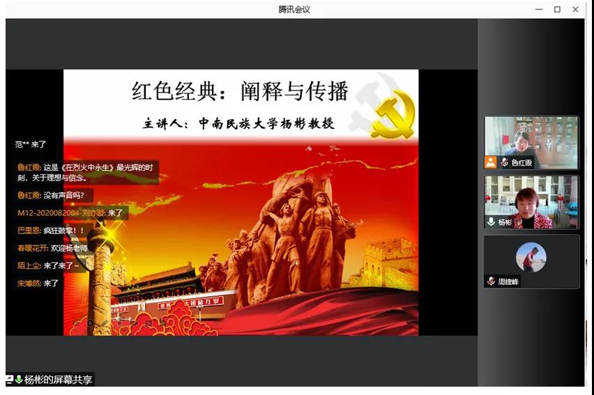 2021年11月15日上午9:00,湖北省作家协会少数民族文学工作委员会副主任,中南民族大学文学与新闻传播学院三级教授,博士生导师杨彬受湖北美术学院公共课部邀请,在“弘扬红色文化 传承国学经典 践行人文美育”系列讲座第三场,以《红色经典:阐释与传播》为题,通过网络为师生奉献了一场精彩的人文讲座。