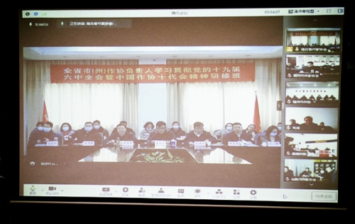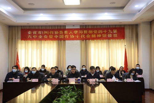 2月25日下午,湖北省作协以视频会议形式举办全省市(州)作协负责人学习贯彻党的十九届六中全会暨中国作协十代会精神研修班。省作协党组书记、副主席文坤斗在研修班上作了专题辅导报告,对党的十九届六中全会、中国作协十代会和省委十一届十次全会精神作了宣讲,并对全省作协学习贯彻工作作了部署。省作协主席李修文主持会议。省作协党组成员、副主席耿瑞华作总结讲话。省作协党组成员、副主席申东辉、江清和,党组成员、秘书长沈小群,一级巡视员高晓晖,部分主席团成员,各部室及直属单位负责同志在省作协会议室参加了研修班。各市州作协负责同志、主席团成员在市州分会场参加了研修班。