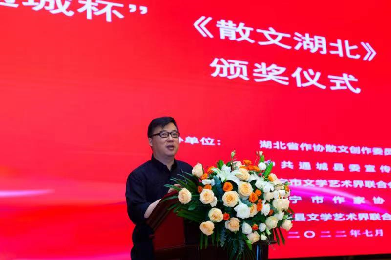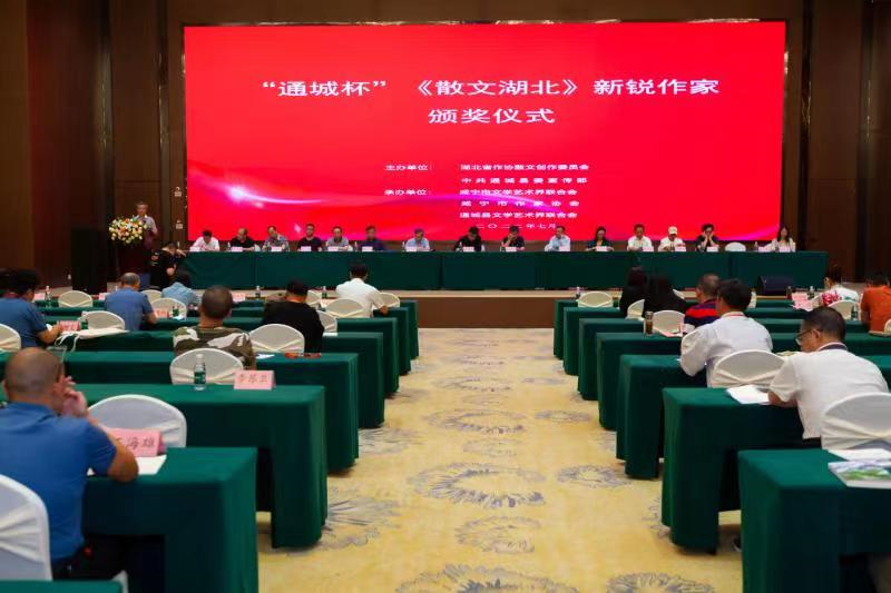 7月15日至18日,由湖北省作协散文创作委员会、通城县委宣传部主办的“通城杯”《散文湖北》新锐作家颁奖暨“喜迎二十大,礼赞新时代”采风创作培训活动在咸宁通城举行,近百名优秀作家、文学爱好者汇聚一堂,共享文学盛宴。省作家协会主席李修文,党组书记、副主席文坤斗,咸宁市政协副主席刘智毅,咸宁市文联党组书记杨志文,通城县委常委、宣传部长刘波,副县长李慧芳等出席活动。省作协党组成员、副主席江清和主持颁奖活动。