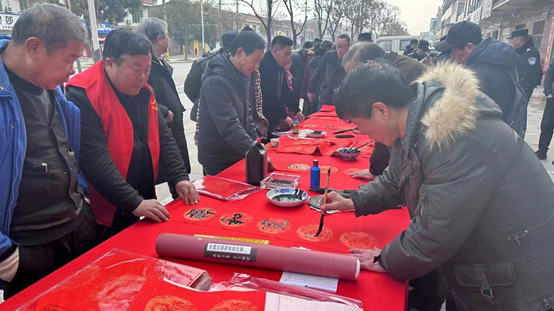 在河口镇的街道边,在石龙头村的村议事室,书法、文字双修的作家们挥毫泼墨,从上午九点半到十二点半,弯腰埋头写春联,写福字,大红烫金纸上跳跃着年的吉祥和祝福,村民们一拨又一拨围上来,看书家现场书写,选取自己中意的对联和福字,欢声笑语,现场弥漫着满满的新年来到的春意。