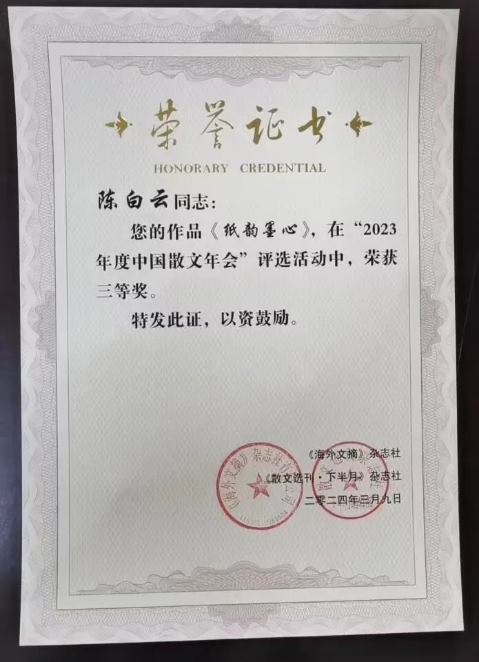 2024年3月8至10日,由《海外文摘》杂志社、《散文选刊·下半月》杂志社主办的2023年度中国散文年会在北京召开。荆州作家陈白云的散文《纸韵墨心》荣获三等奖。