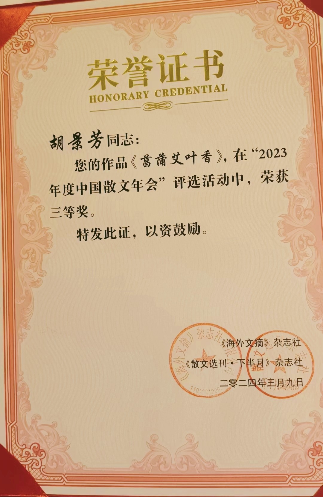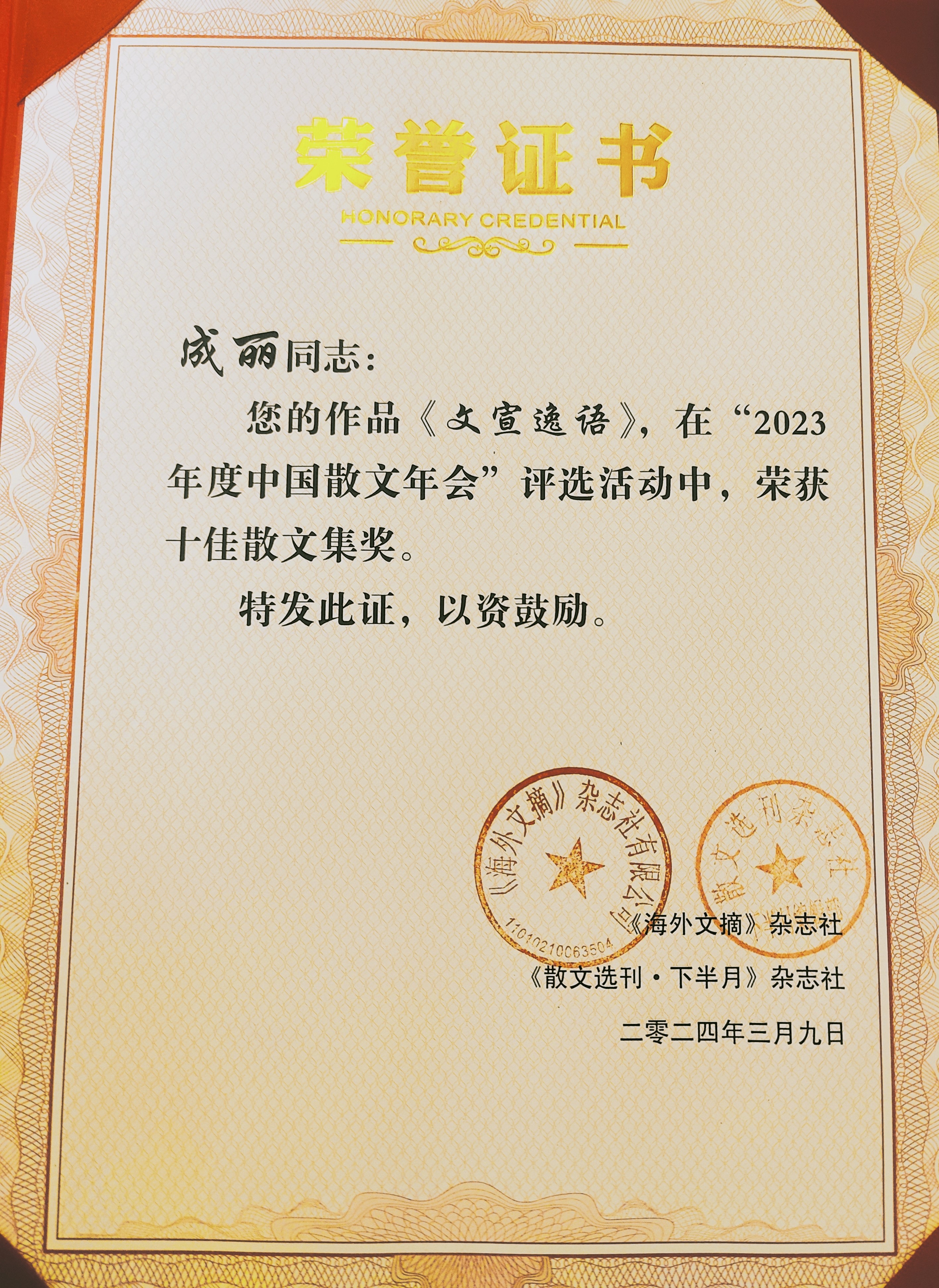 近日,由《海外文摘》杂志社、《散文选刊·下半月》杂志社主办的“2023年度中国散文年会”在北京召开,会上评选出5个年度奖项。其中通山作家胡景芳的散文《菖蒲艾叶香》荣获三等奖,成丽的散文集《文宣逸语》荣获“十佳散文集奖”,这也是成丽继《月从故乡来》获2020年度中国散文年会“十佳散文集奖”后,再次荣获此奖项。