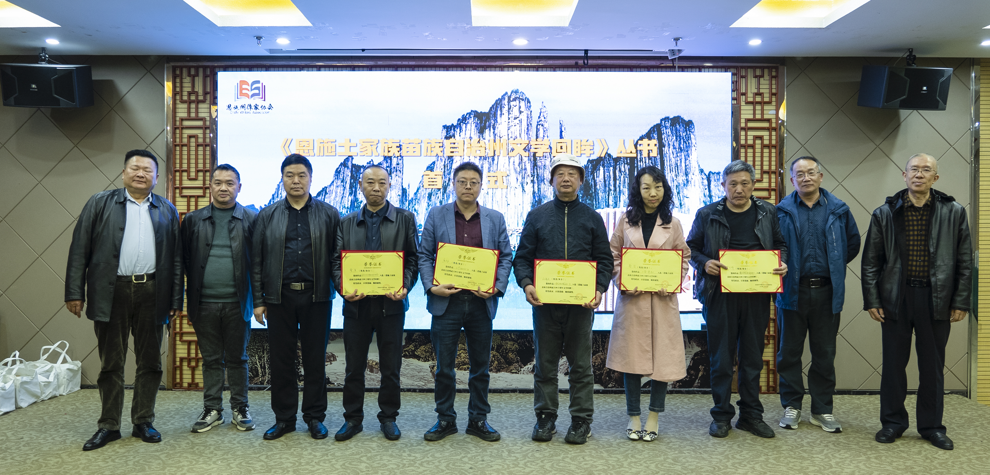 首发式上,湖北省作家协会发来贺信,丛书各分卷主编向入选作家代表颁发证书,恩施州作家协会向湖北民族大学图书馆、恩施职业技术学院图书馆、湖北恩施学院图书馆、州图书馆、州档案馆、州博物馆、州文化馆、省新华书店(集团)恩施州分公司等单位赠送图书,入选丛书作家代表、编委会暨分卷主编代表在首发式上分别发言。