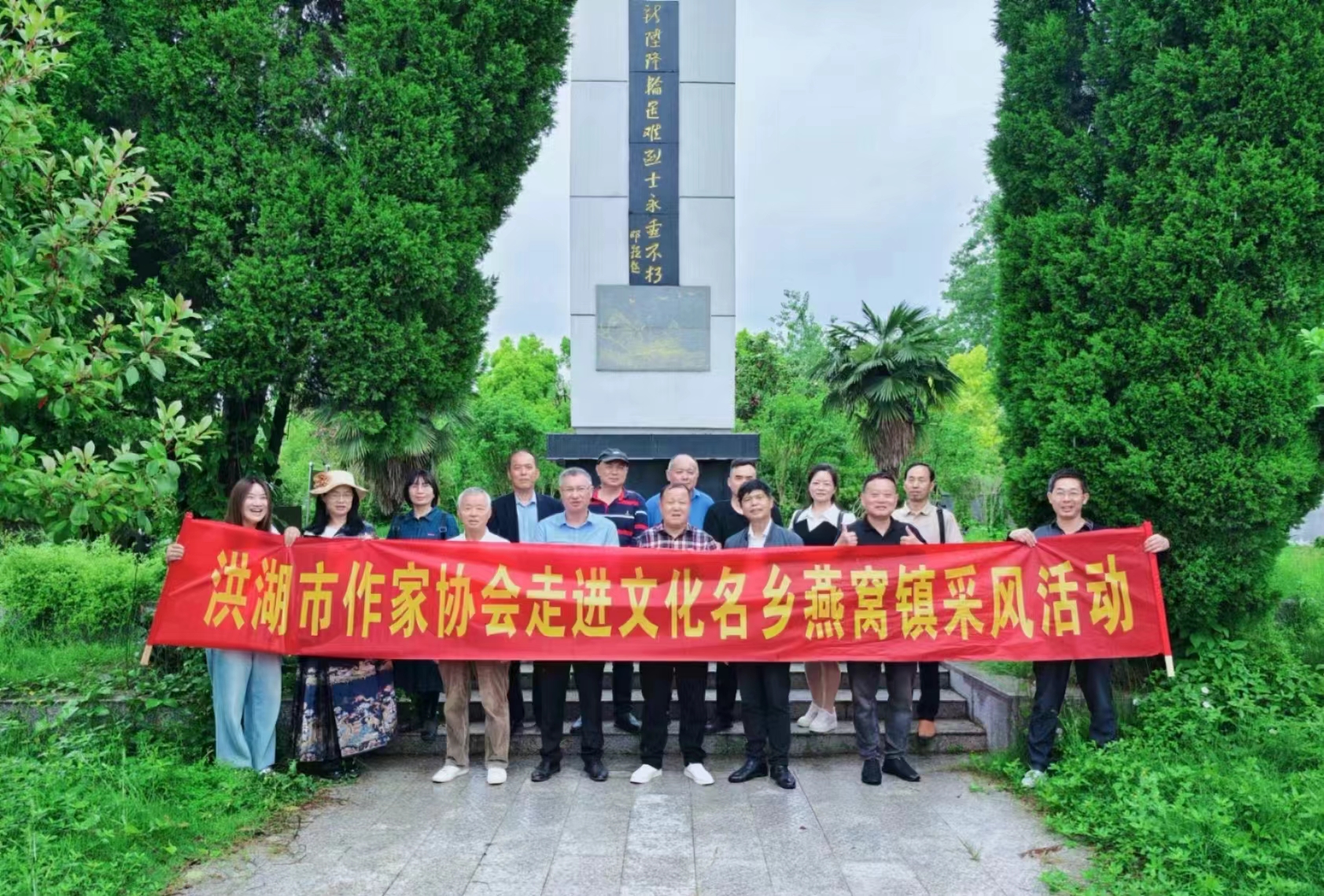 4月28日,洪湖市作家协会部分作家冒雨来到长江之滨燕窝镇,先后参观了天福洲村文化长廊、姚湖村万亩蔬菜大棚基地、燕窝高粱酒酿造企业,瞻仰了新升隆烈土纪念园和姚湖烈土纪念碑。