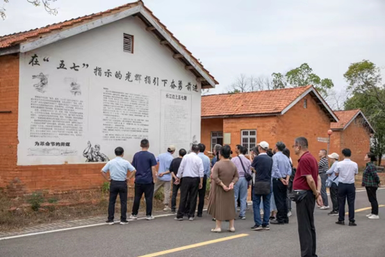 随后,作家们来到了咸宁市向阳湖文化名人旧址五七干校处,先后参观了展览馆和旧址。推开五七干校斑驳的铁栅栏门,三纵一横的红砖平房,尽显岁月的苍茫。在展览馆内,作家们仔细阅览着下派到向阳湖的诸多全国著名文化名人当初创作的作品,了解他们曾在这里使用过的物品,激发出强烈的历史感。在王家咀五七干校住宅区,每一间房子都标注着当初居住的文化名人的名字,让人有一种身临其境的感觉。沿着村路纵深前行,作家们一路感受着当初的文化氛围,此情此景,勾起对老一辈作家的回忆。作家们聚集在一面粗犷的墙画前,充满激情地朗诵起诗人郭小川的诗歌《长江边上五七路》,瞬间把现场作家拉回到了那个年代。