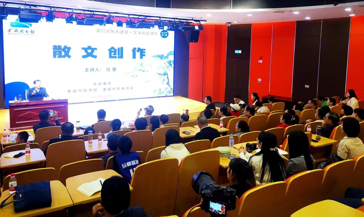 11月3日,由孝感市图书馆、孝感市作家协会联合主办的“文学名家课堂”在市图书馆澴川文化大讲堂开讲,著名散文作家任蒙先生以《散文的五个为什么》为题进行现场授课。孝感市图书馆馆长刘艺等有关领导以及来自孝感市直和部分县市区的作协会员、文学爱好者、学生以及家长160余人参加了活动。孝感市文联副主席、作协主席方东明热情洋溢致辞欢迎任蒙老师莅临孝感讲学。