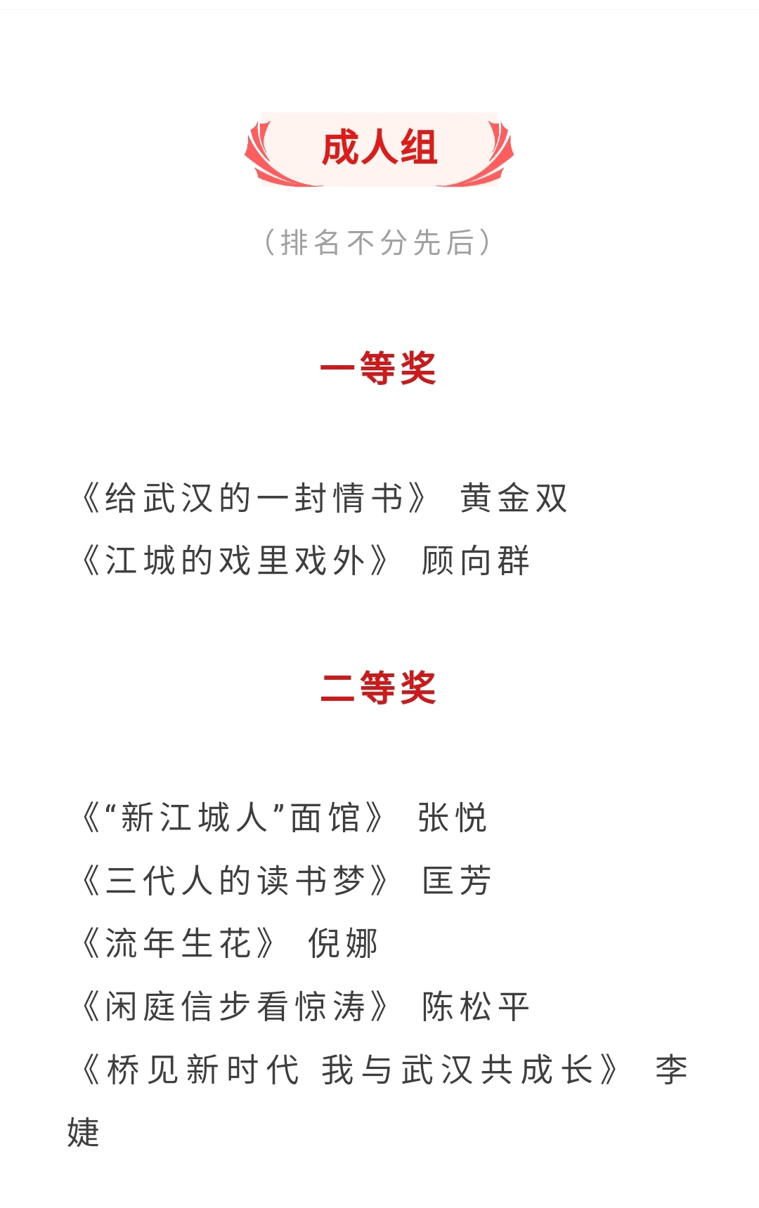 2024年,在新中国成立75周年之际,“书香武汉”于9月启动了“时代画卷中的武汉——我与新中国同梦、同行、同成长”迎国庆征文活动,汉阳作协会员黄金双老师在高手如云参赛选手中一举夺魁,《给武汉的一封情书》获得征文一等奖。