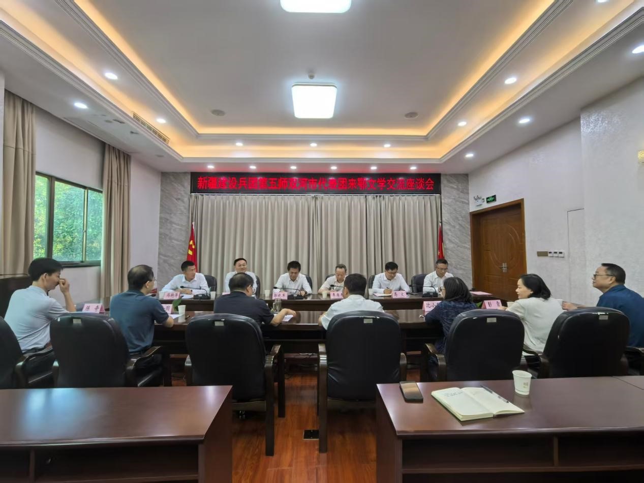 2025年10月11日下午,新疆生产建设兵团第五师双河市代表团在第五师双河市委常委、副政委、宣传部部长郭晓军带领下,一行5人,来到湖北省作协开展文学交流。省委宣传部二级巡视员李府平、省作协在汉党组领导及相关负责同志参加了座谈会。