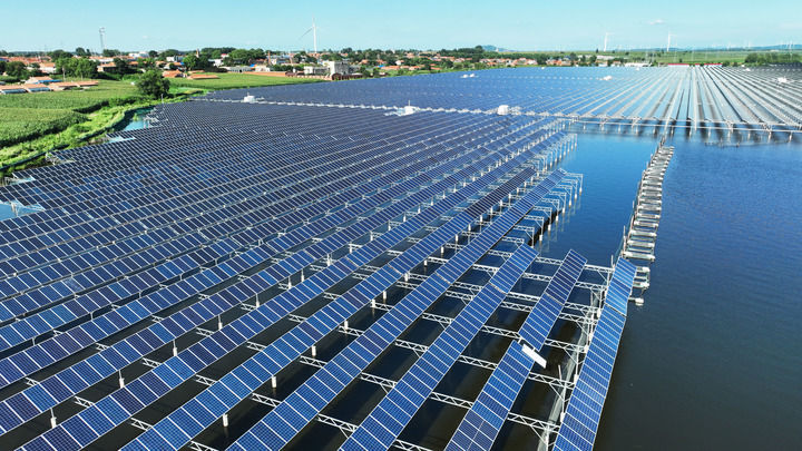 2025年7月30日在辽宁省铁岭市铁岭县大青水库拍摄的光伏发电板(无人机照片)。新华社记者 杨青 摄