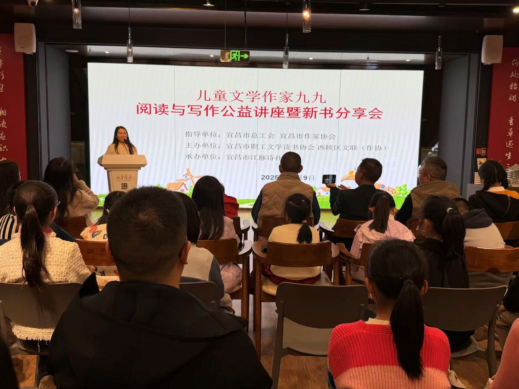 11月9日,宜昌知名儿童文学作家九九受邀走进屈原书城,以“故土·万物·与光同在”为主题,为江豚诗社的孩子们开展了一场别开生面的阅读与写作公益讲座。本次讲座由宜昌市总工会、宜昌市作家协会指导,宜昌市职工文学读书协会、西陵区文联(作协)共同主办,江豚诗社承办。知名作家肖思科、张永久、阎刚、刘小平等与现场60余名小社员、家长以及文学爱好者,共赴一场关于故乡、文学与成长的温暖对话。