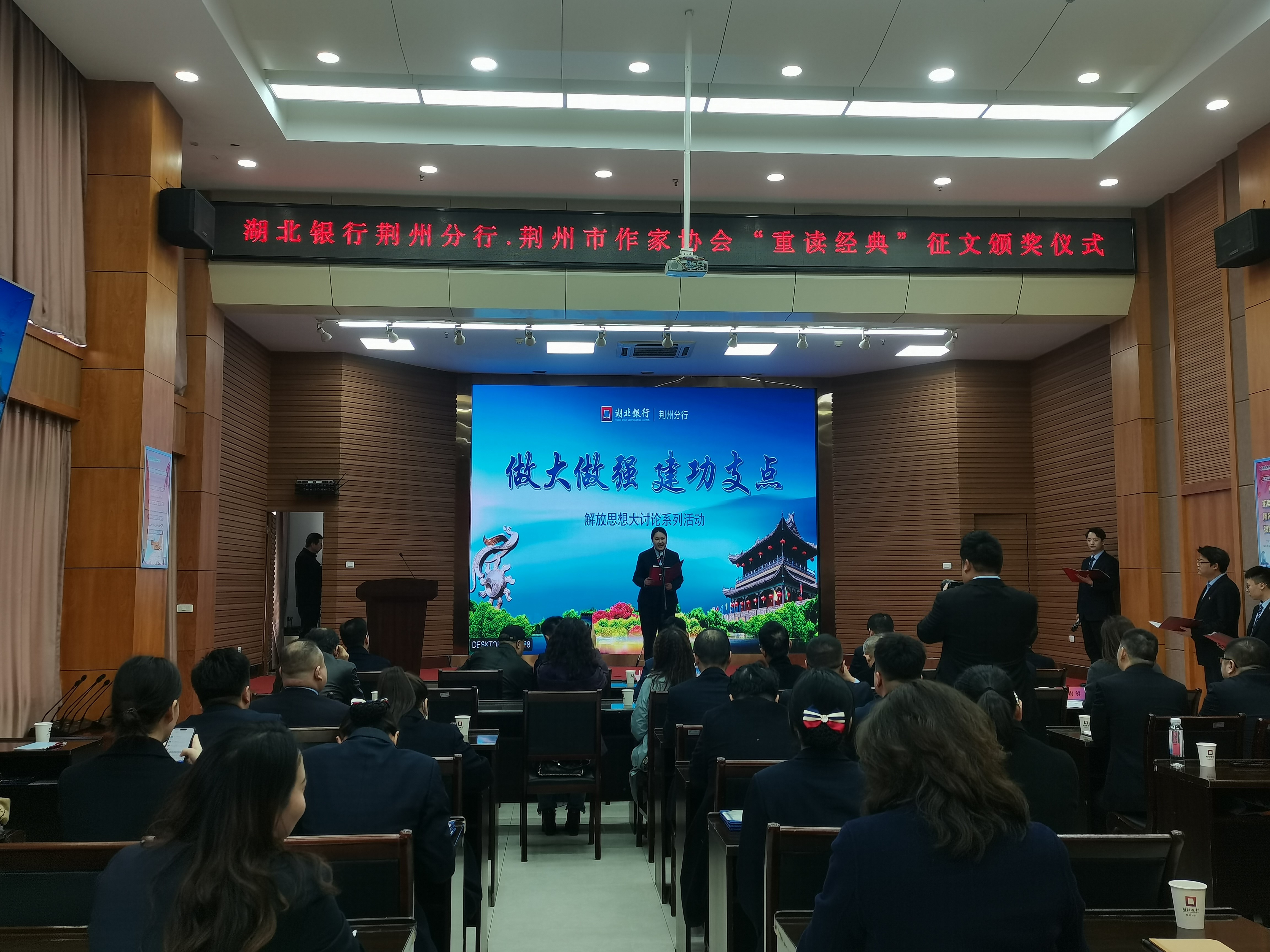 11月13日,“一起重读毛泽东经典著作”征文活动颁奖仪式在湖北银行荆州分行举行,本次活动由荆州市文学艺术界联合会指导,湖北银行荆州分行与荆州市作家协会联合主办。市文联党组书记张航,湖北银行荆州分行党委书记、行长鲁平及班子成员,市作协主席熊湘鄂及主席团部分成员,获奖代表60余人出席活动。